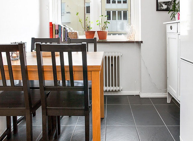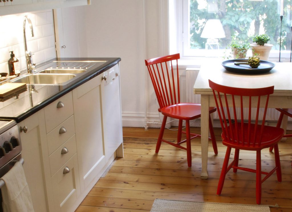 Renoverat kök med vackert trägolv i sekelskifteslägenhet på Söder i Stockholm - Här gjorde vi köket till en mysigare plats för goda middagar och sällskapsspel för hela familjen. Vi använde några liter vit färg på väggarna, sydde upp en vit hissgardin, renoverade en antik kommod, beställde en vacker handvävd trasmatta, tog...